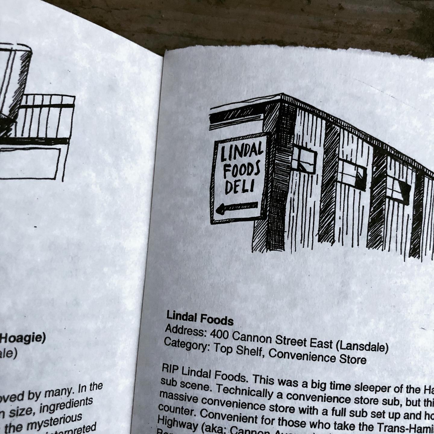 SUBS. Hands down, Hamilton Ontario's most beloved fast food and locally, a topic almost as contentious as doughnuts. This zine chronicles sub joints past and present through mini-reviews and ink drawings with a side of class consciousness. There is even a handy map insert. Comes in a submarine bag.