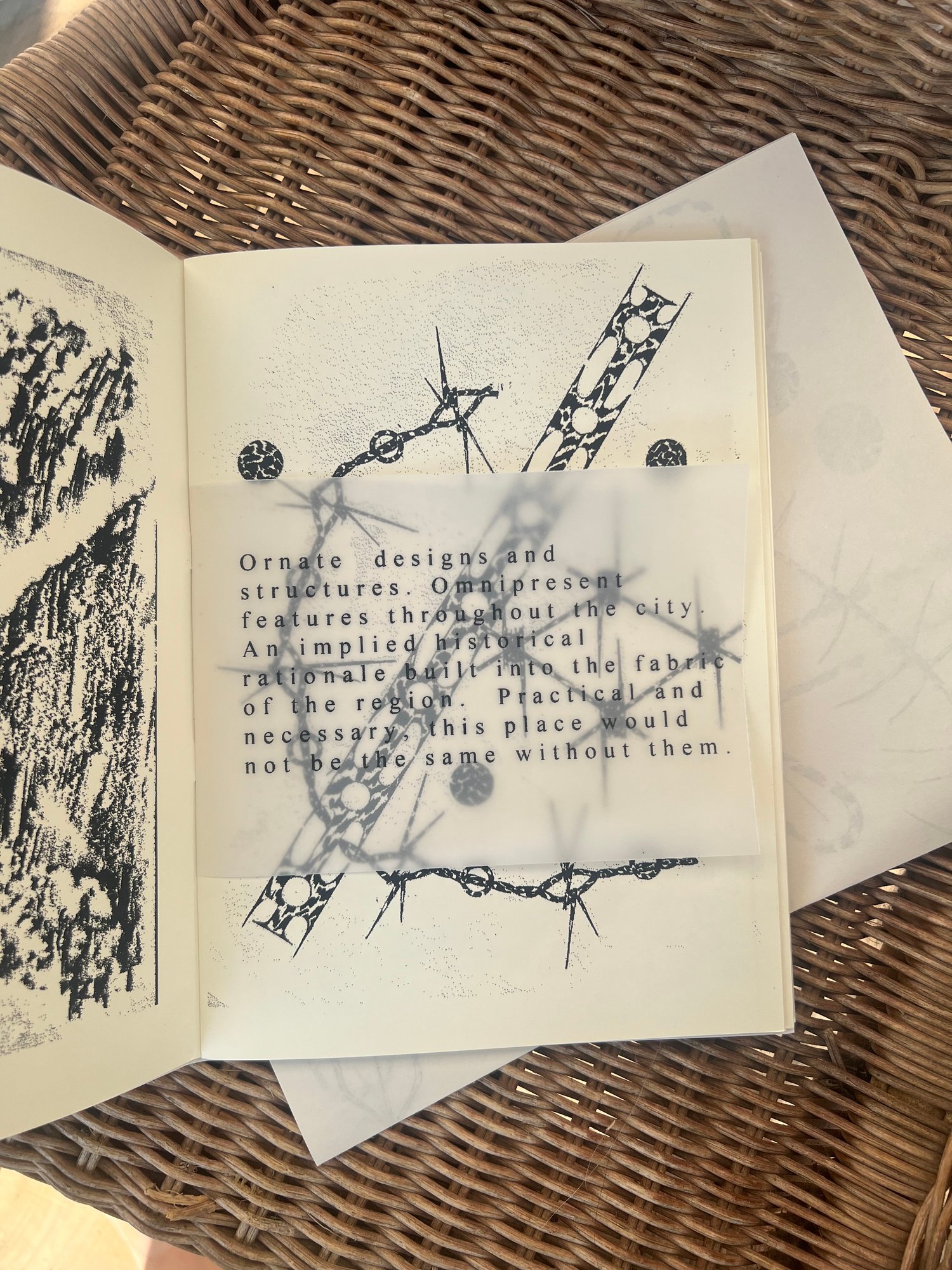 “VISITANTE/VISITOR is a collaboration with Rafa and El Futuro Editiones and includes a collection of drawings and contact tracings inspired by the fencing and municipal organization of Bogota, Colombia. “Ornate designs and structures. Omnipresent features throughout the city. An implied historical rationale built into the fabric of the region. Practical and necessary, this place would not be the same without them”.