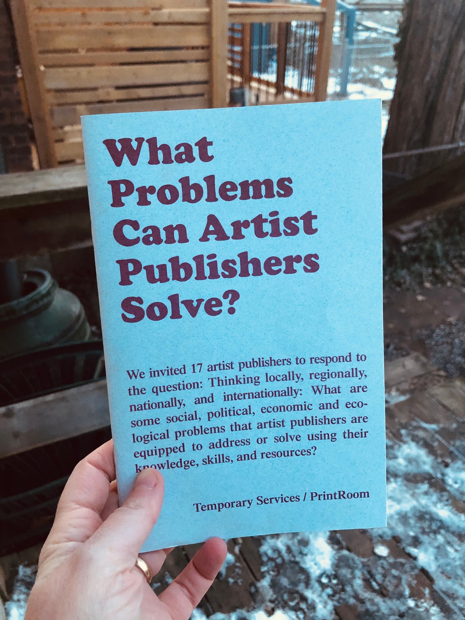"Temporary Services booklet #118 is a collaboration with our old friends at PrintRoom in Rotterdam, produced in advance of a mini-showing of our Self-Reliance Library in July 2018. For this booklet we invited 17 artist publishers to respond to the question: Thinking locally, regionally, nationally, and internationally: What are some social, political, economic and ecological problems that artist publishers are equipped to address or solve using their knowledge, skills, and resources?